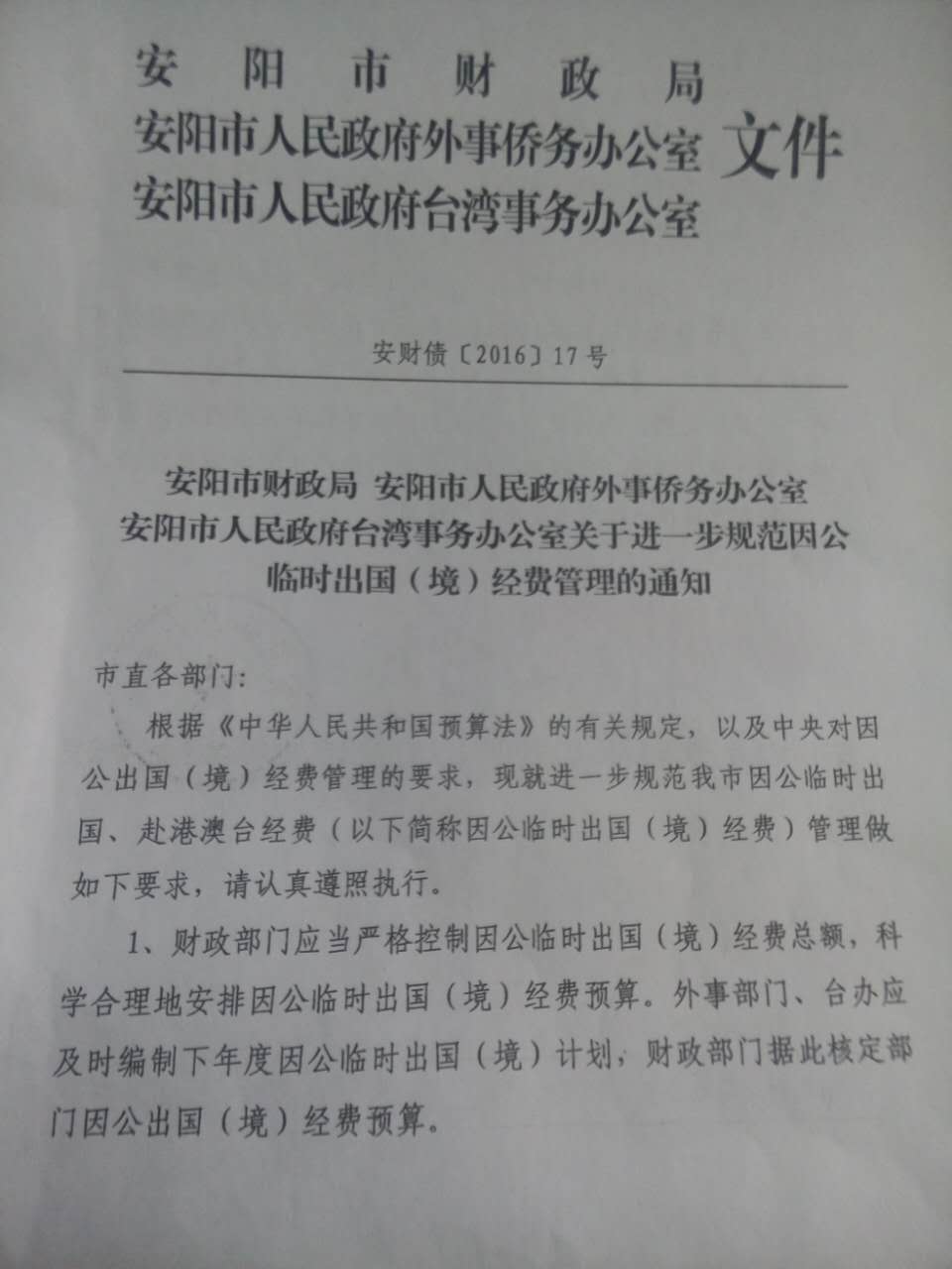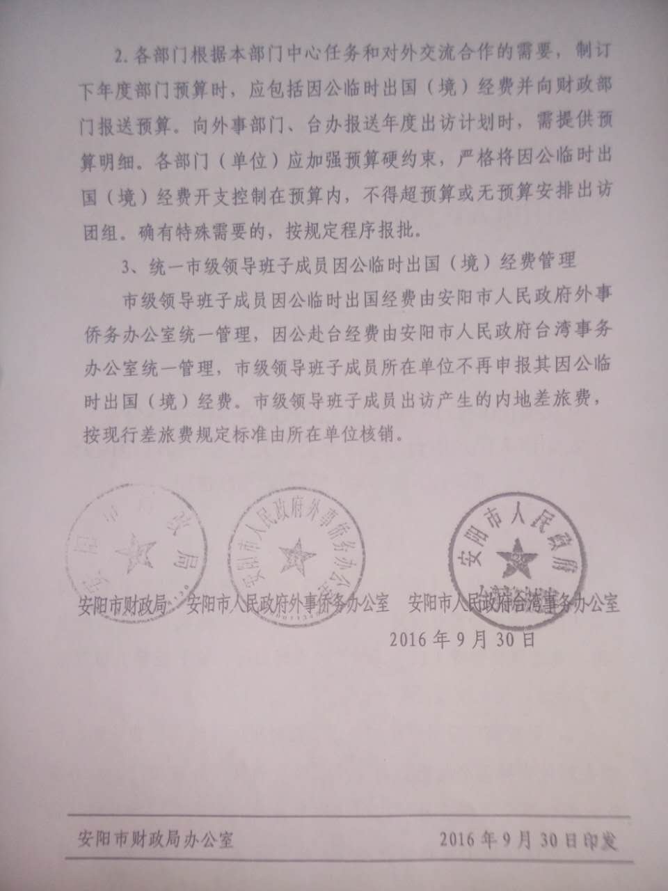 安阳市财政局安阳市人民政府外事侨务办公室 安阳市人民政府台湾事务办公室关于进一步规范因公临时出国(境)经费管理的通知