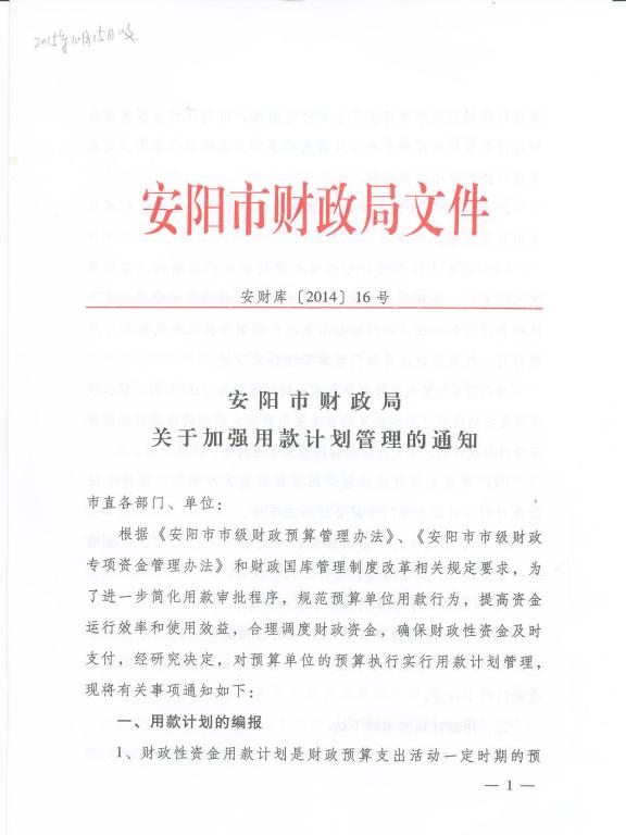 安阳市财政局关于加强用款计划管理的通知
