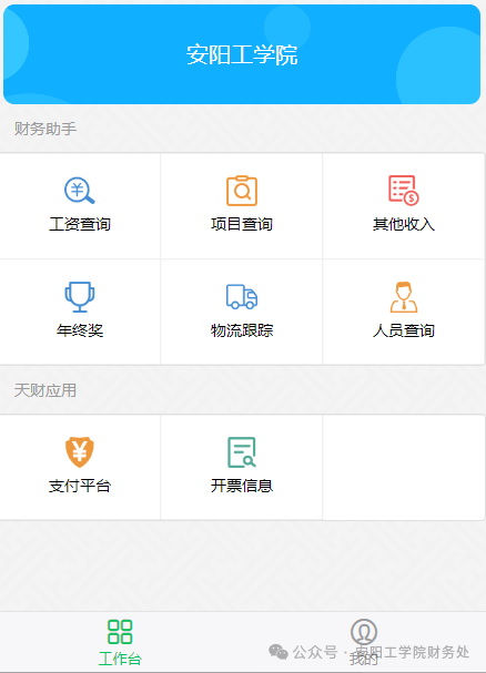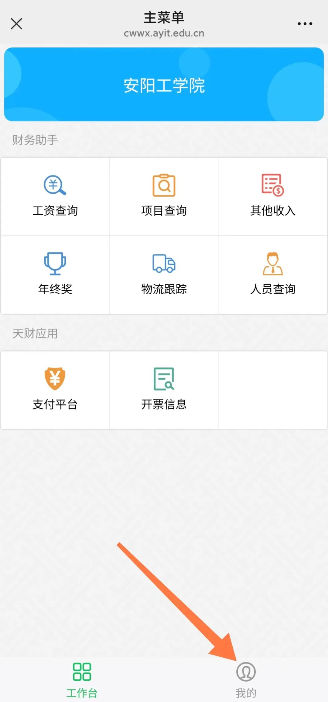 打开已绑定工号/学号的微信,进入“安阳工学院财务处”微信公众号的“财务平台”主界面,点击下方“我的”。
