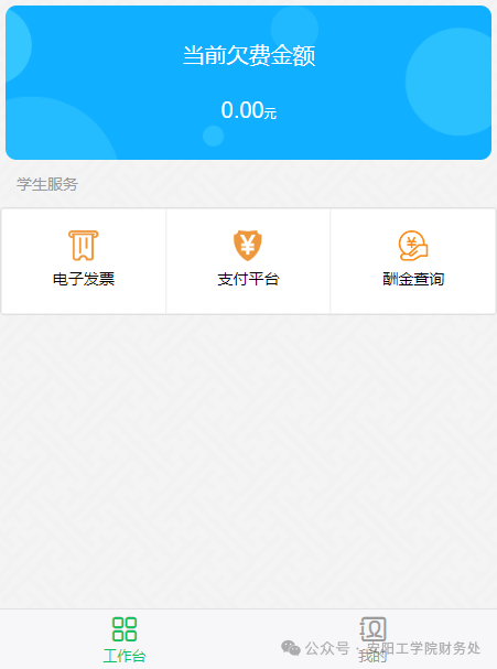 学生绑定学号后,可在财务平台中免登录进入“安阳工学院统一支付平台(简称支付平台)”进行缴费、查询缴费电子发票、学校发放给本人的各类奖助学金、劳务费等,并可接收财务系统通过本公众号发送的提示信息。