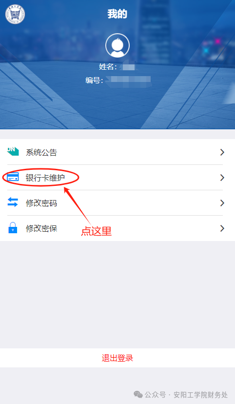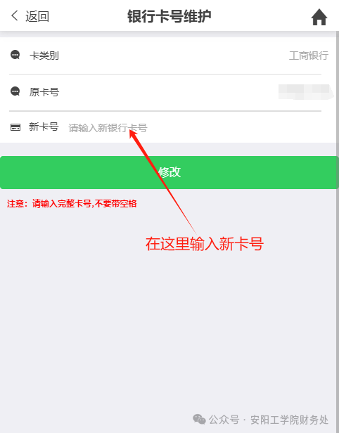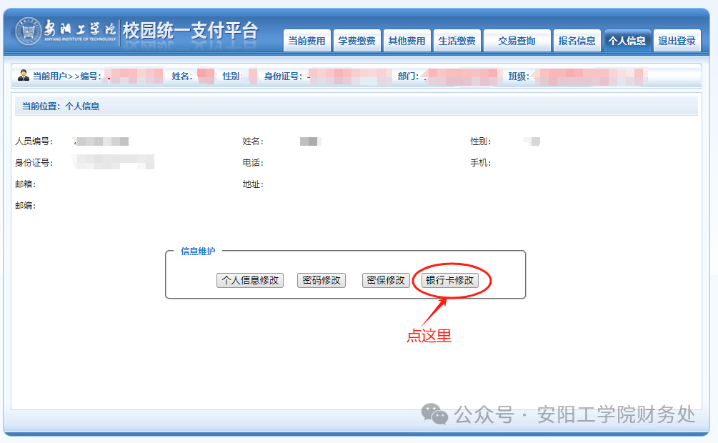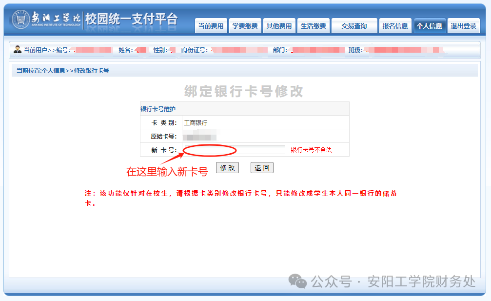 如学生办理的银行卡丢失,到银行补办新卡后,请按以下方法修改学生在财务系统中预留的银行账号。