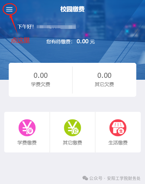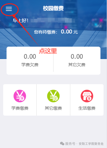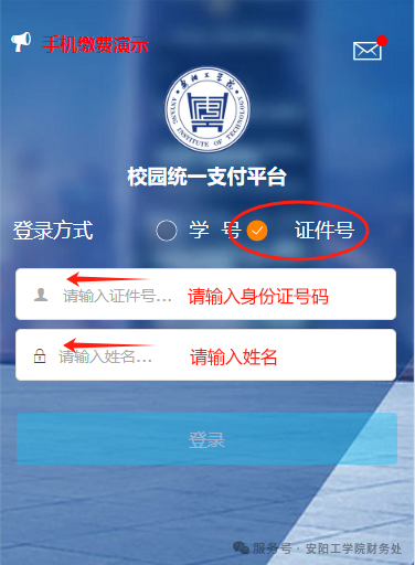 方法二:点击“安阳工学院财务处”微信公众号下方的“学生缴费”,输入用户名(学号)和密码(身份证号码后六位)登录,也可在登录界面选择证件号+姓名方式登录。