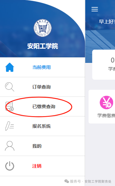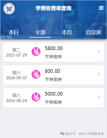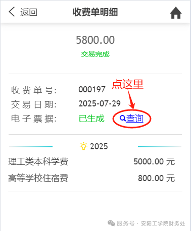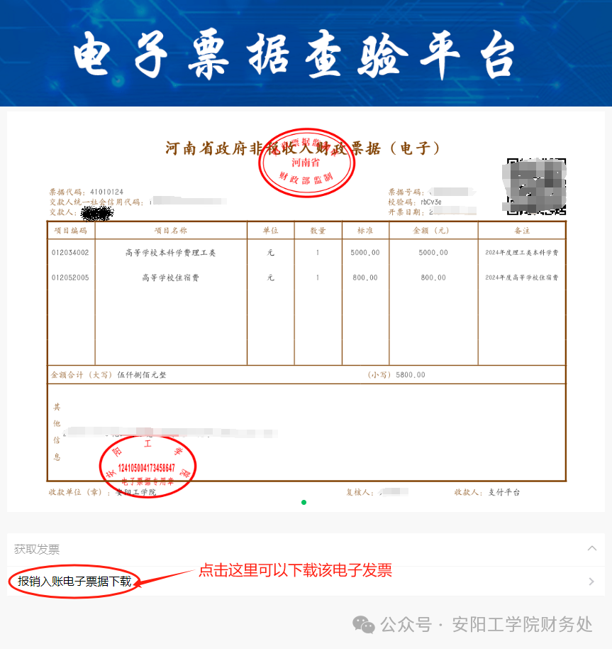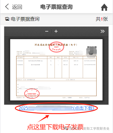 方法二:点击安阳工学院财务处微信公众号“财务平台”->“电子发票”,可查询、下载全部缴费电子发票。