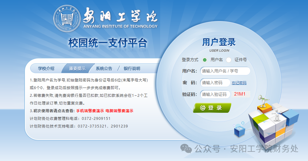 学生需通过“安阳工学院校园统一支付平台”(以下简称支付平台)自主缴纳相关费用。该支付平台支持微信、支付宝缴费,学校不受理现金缴费和银行卡转账、代扣等缴费方式。