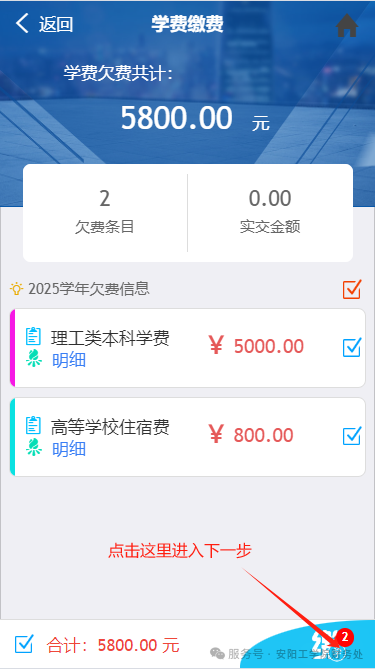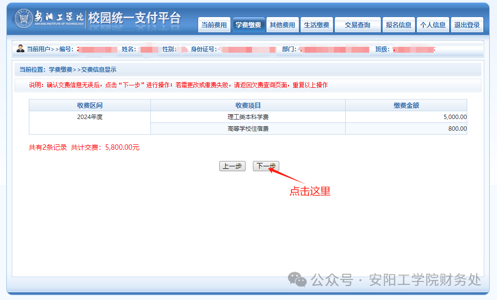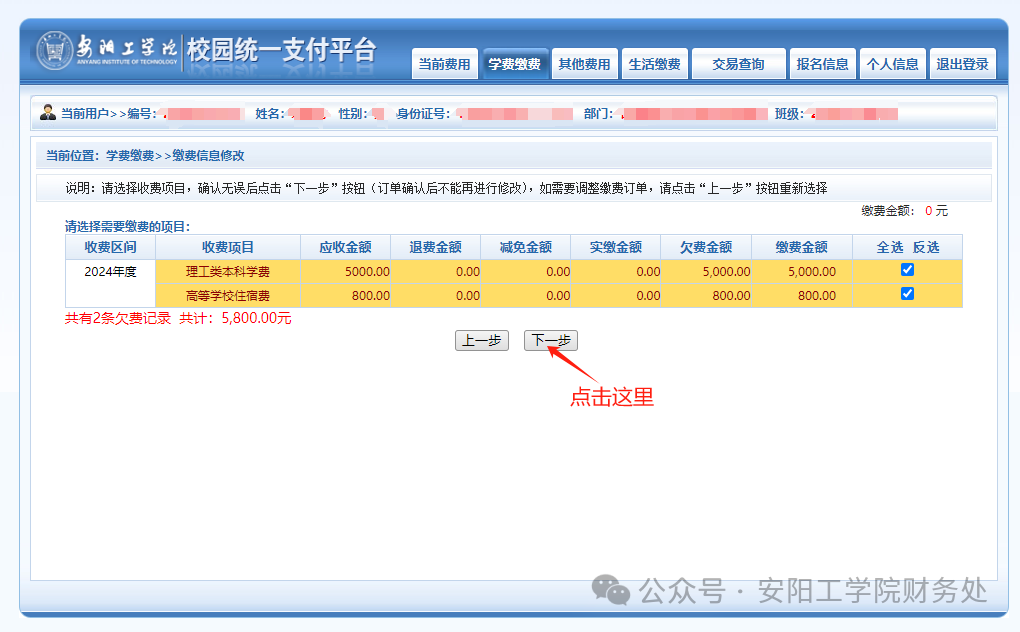 第五步:选择您需要缴费的项目(默认全部选择),然后点界面中的“下一步”按钮,进入如下界面。