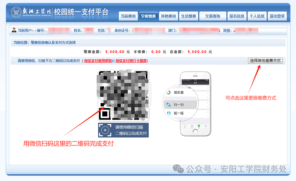 第六步:请确认收款方为“安阳工学院”,选择您的付款方式并点击“确认支付”按钮进入支付界面并完成支付。