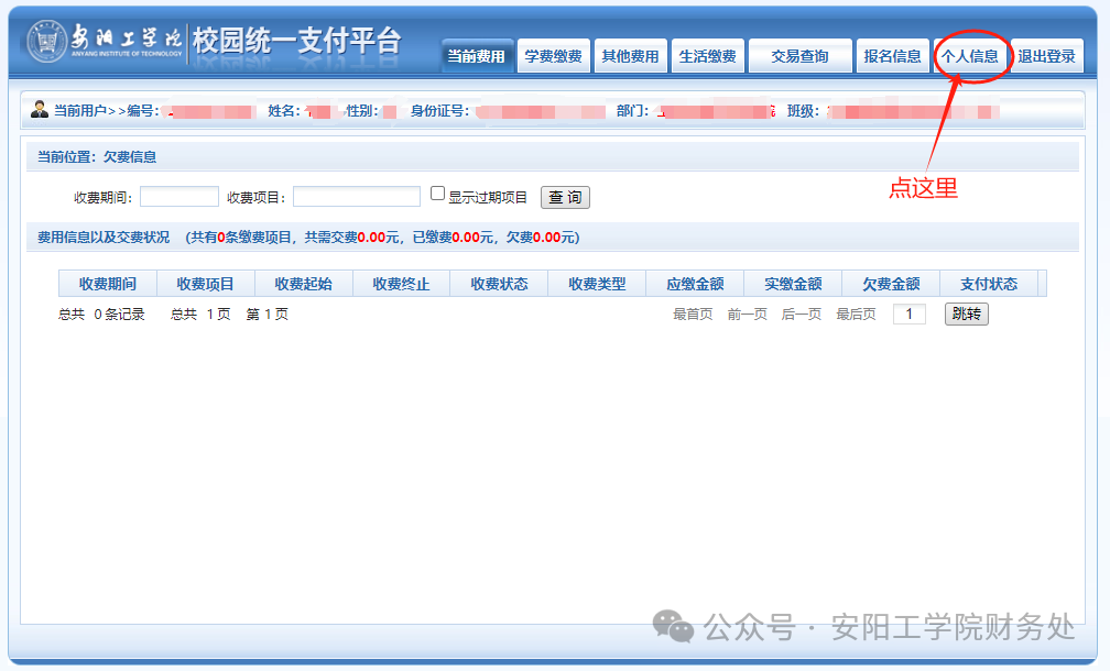 方法一:点击“安阳工学院财务处”微信公众号下方的“财务平台”菜单进入财务平台,点击财务平台中的“支付平台”图标,可免登录直接进入支付平台。